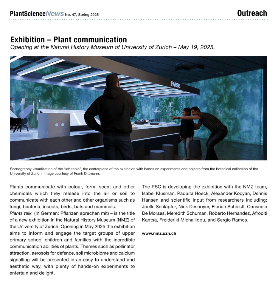 I’m very excited to announce that in May 2025, the Zurich-Basel Plant Science Centre will be opening an amazing exhibition for everyone to enjoy called “Plant Communication” at the Natural History Museum in the main building of the University of Zurich (for more information, visit https://www.plantsciences.uzh.ch/en.html).